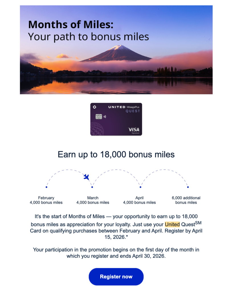 For those of you with the United Quest card, it looks like Q1 is shaping up to be an offer-heavy quarter. Some card holders have already received three unique offers: