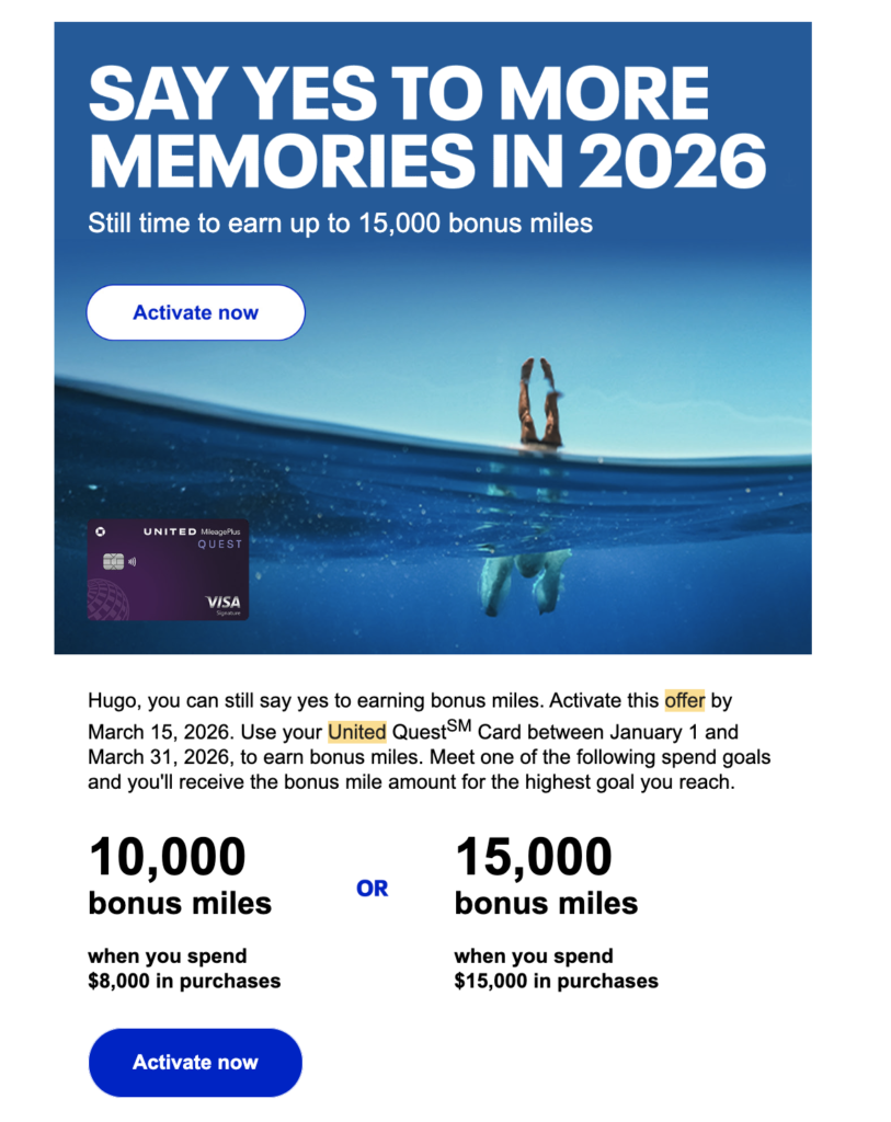 Some cardholders have also received a separate Year of Yes promotion. This starts January 1st and rolls through the end of March, offering 10,000 to 15,000 bonus miles to spending on different Q1 spend numbers. The author received a 10,000 bonus mile offer for $8,000 in spend, a reasonably achievable number. Others have reported much higher spend requirements, suggesting that United and Chase are dynamically structuring these offers against existing spend.